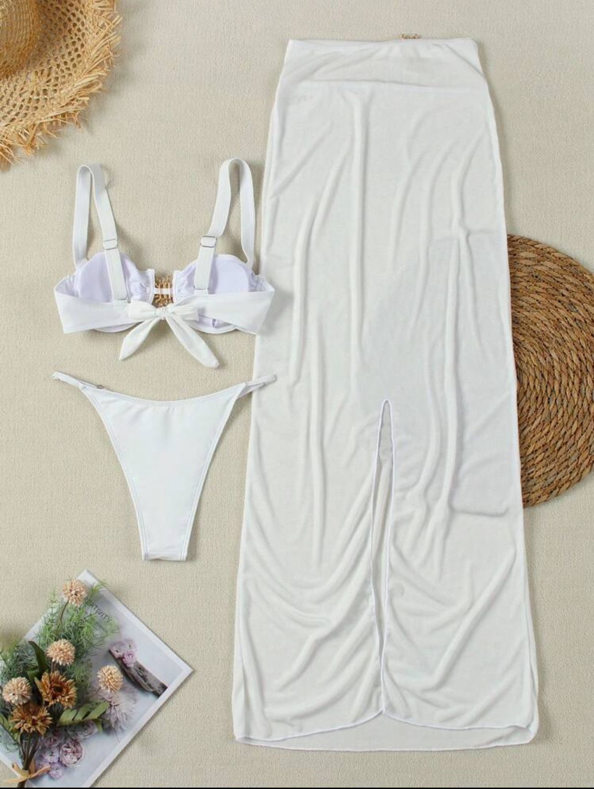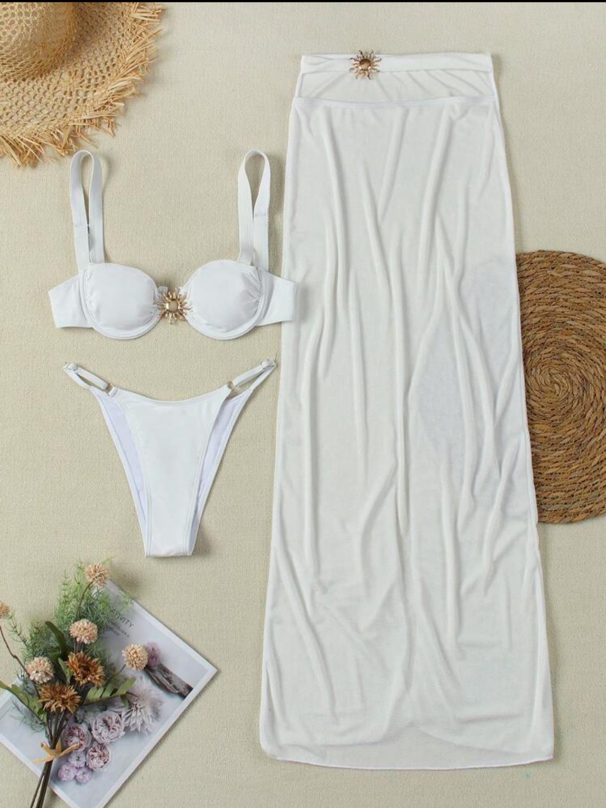 traje de baño con falda larga aplique de sol dorado son tres piezas