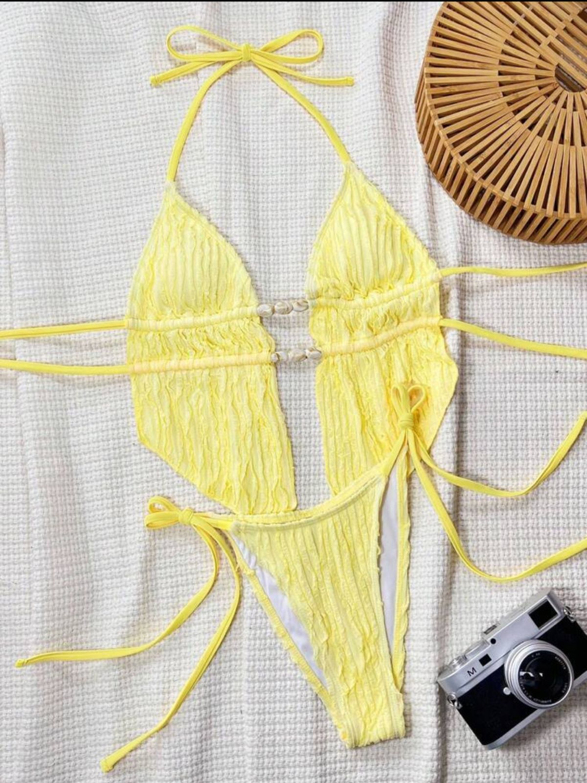 traje de baño amarillo 2 piezas aplique de tagua brasier con vuelo
